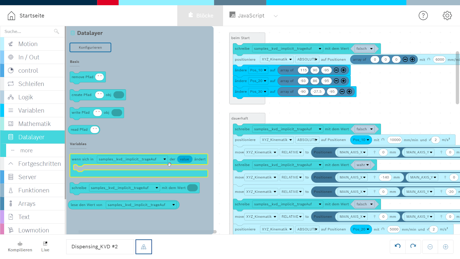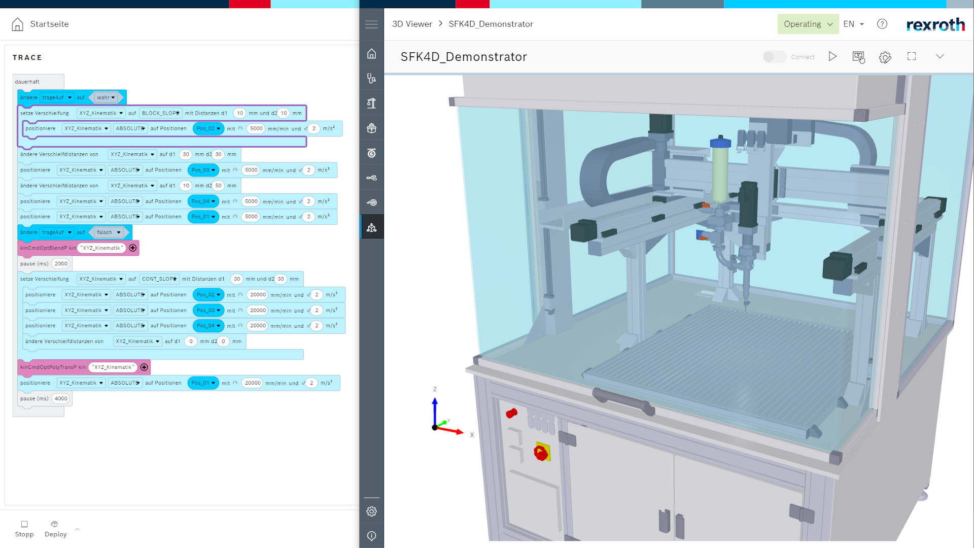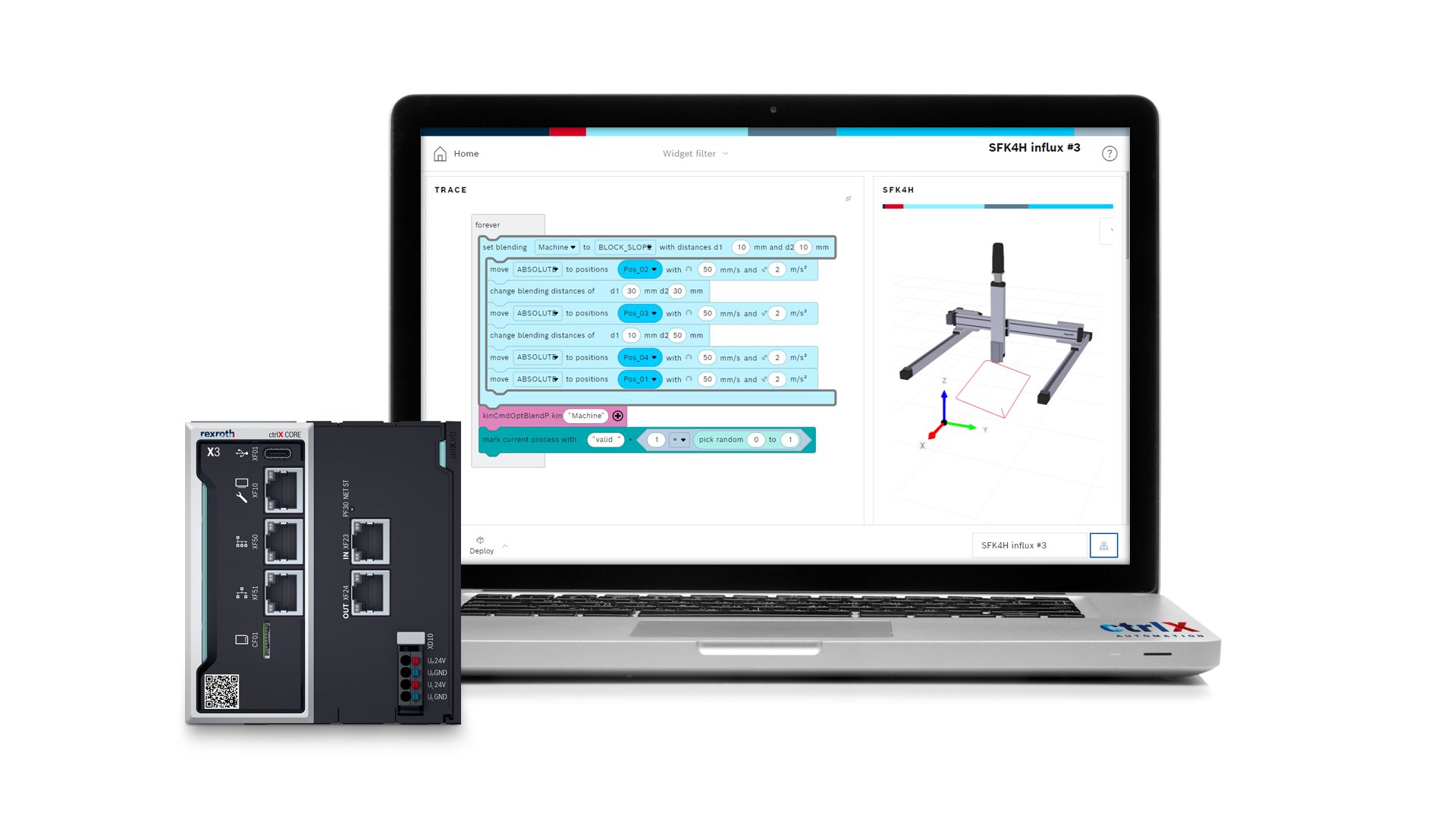 Mit der IDE App hält der Low-Coding-Trend Einzug in die Automatisierungsbranche. Einfache Anwendungen lassen sich damit auch ohne umfassende Programmierkenntnisse entwickeln. Visuelle Elemente werden aneinandergereiht und parametriert und ersetzen klassischen Code. Die App bietet eine komplette Entwicklungsumgebung für die visuelle Programmierung unter dem Betriebssystem ctrlX OS von Bosch Rexroth. Sie läuft direkt auf der Steuerung und benötigt lediglich einen Web-Browser.