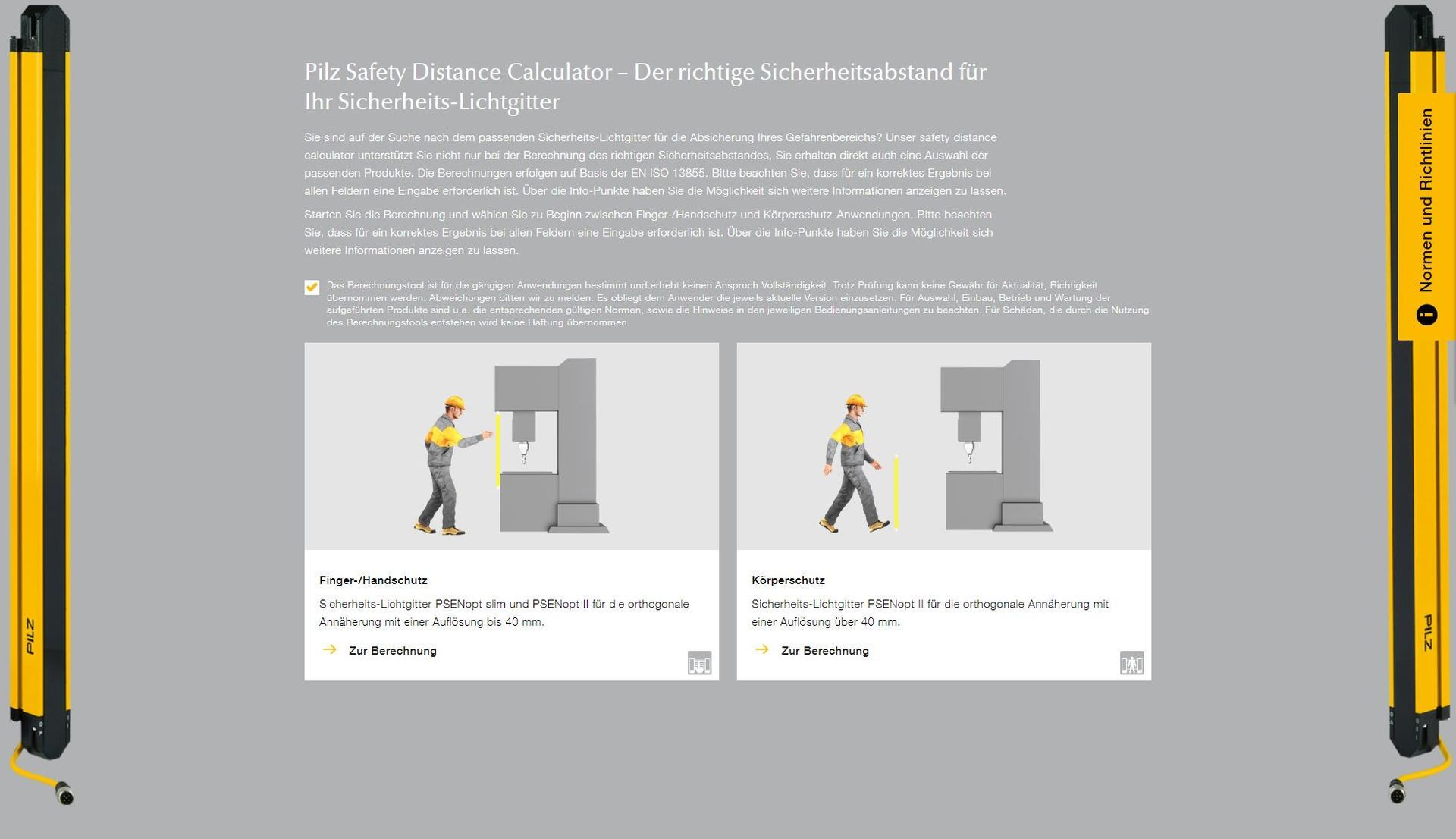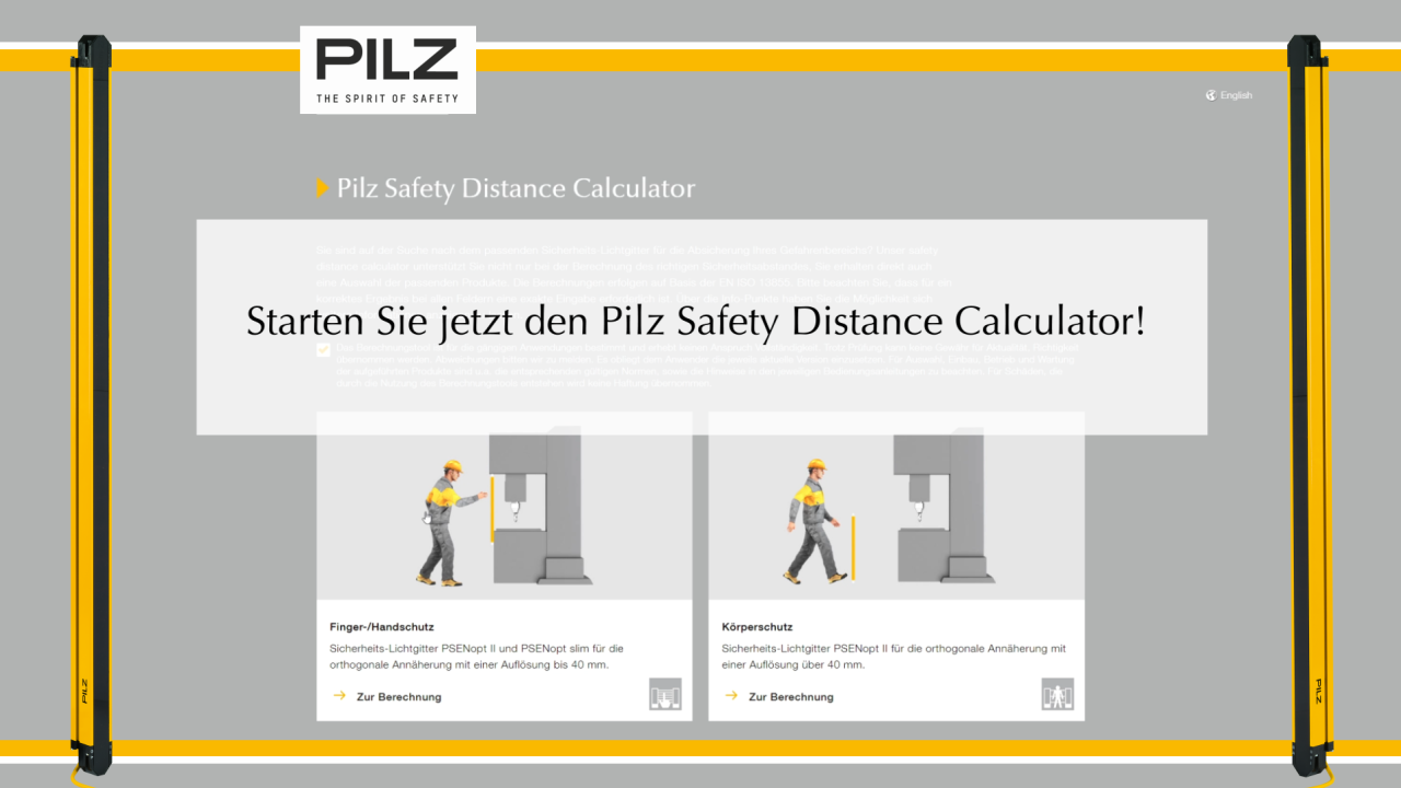 Der Sicherheitsabstand eines Lichtvorhangs ist entscheidend für den sicheren Betrieb einer Anlage. Für Maschinentypen, für die keine C-Norm existiert, muss die Berechnung der Mindestabstände bei berührungslos wirkenden Schutzeinrichtungen der EN ISO 13855 angewendet werden. Mit dem Pilz safety distance calculator kann anhand von definierten Werten der benötigte Abstand für individuelle Anwendungen ganz einfach berechnet werden.